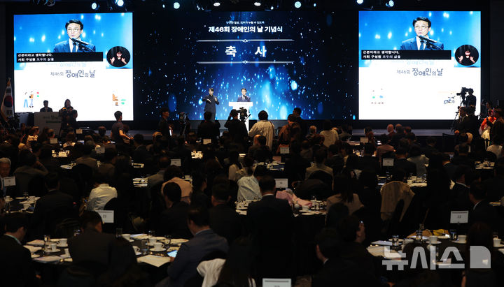 [서울=뉴시스] 조성우 기자 = 김민석 국무총리가 20일 서울 광진구 워커힐호텔에서 열린 제46회 장애인의 날 기념식에서 축사를 하고 있다. 2026.04.20. [email protected]
