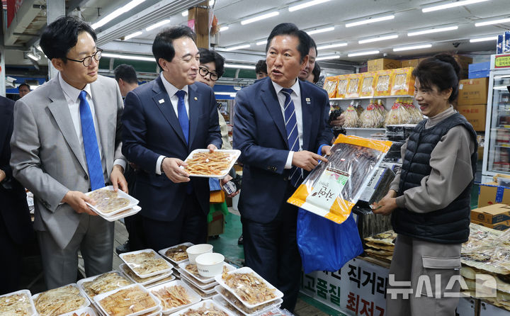 [보령=뉴시스] 고승민 기자 = 정청래 더불어민주당 대표와 박수현 충남도지사 후보가 20일 충남 보령 대천항수산시장을 방문, 상인과 대화하고 있다. (공동취재) 2026.04.20. [email protected]