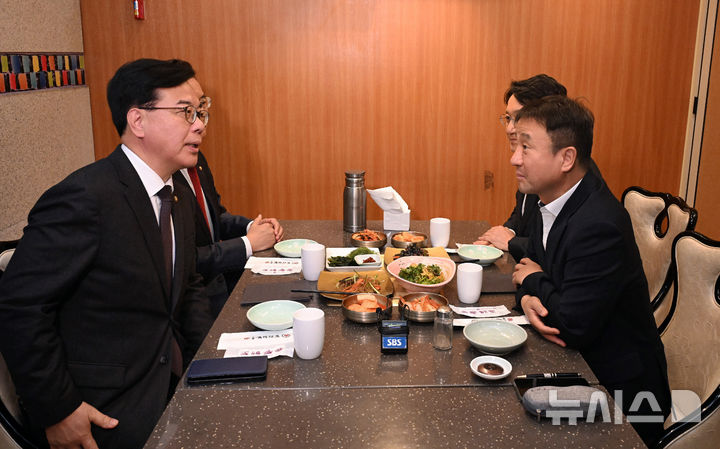 [서울=뉴시스] 국회사진기자단 = 한병도(오른쪽) 더불어민주당 원내대표와 송언석 국민의힘 원내대표가 20일 서울 여의도의 한 음식점에서 오찬 회동을 하고 있다. 2026.04.20. [email protected]