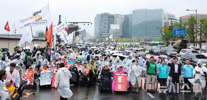 [서울=뉴시스] 김선웅 기자 = 20일 서울 종로구 경복궁 앞 도로에서 열린 420장애인차별철폐공동투쟁 결의대회에서 참가 시민들이 장애인 이동권, 교육권, 노동권, 탈시설, 자립생활권리 등 생존권 보장을 촉구하고 있다. 2026.04.20. [email protected]