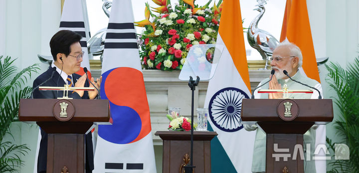 [뉴델리=뉴시스] 고범준 기자 = 이재명 대통령과 나렌드라 모디 인도 총리가 20일(현지 시간) 뉴델리 영빈관 하이데라바드 하우스에서 공동언론발표를 하며 박수를 치고 있다. 2026.04.20. [email protected]