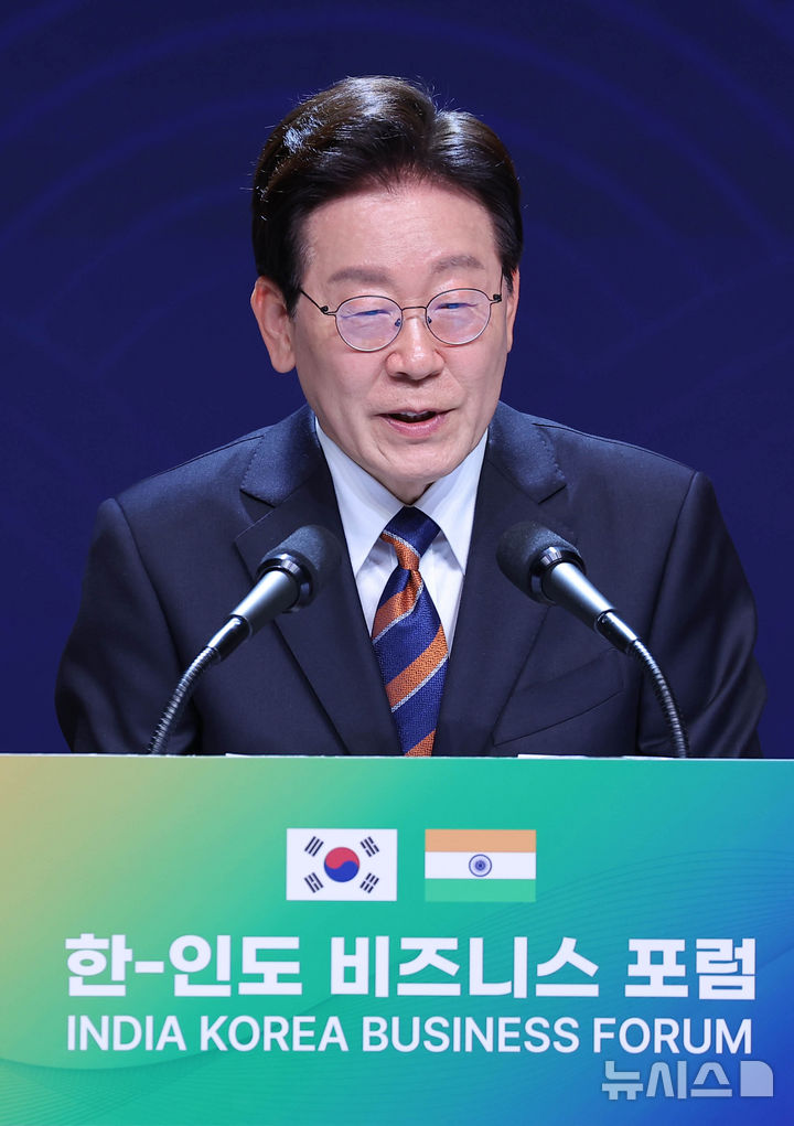 [뉴델리=뉴시스] 고범준 기자 = 이재명 대통령이 20일(현지 시간) 인도 뉴델리 바랏 만다팜 센터에서 열린 한-인도 비즈니스 포럼에서 인사말을 하고 있다. 2026.04.20. [email protected]