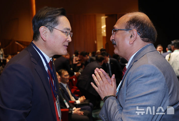[뉴델리=뉴시스] 고범준 기자 = 이재용 삼성전자 회장이 20일(현지 시간) 인도 뉴델리 바랏 만다팜 센터에서 열린 한-인도 비즈니스 포럼에서 인도기업 관계자와 인사를 하고 있다. 2026.04.20. [email protected]