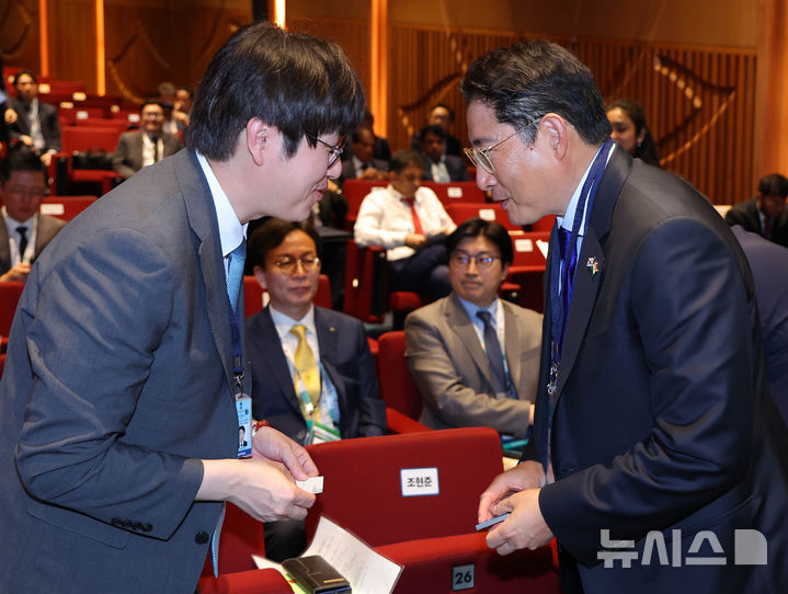 [뉴델리=뉴시스] 고범준 기자 = 하정우 AI미래기획수석과 조현준 효성 대표이사 회장이 20일(현지 시간) 인도 뉴델리 바랏 만다팜 센터에서 열린 한-인도 비즈니스 포럼에서 인사를 하고 있다. 2026.04.20. [email protected]