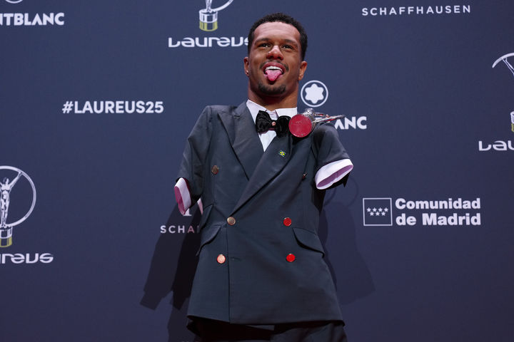 [마드리드=AP/뉴시스] 브라질의 패럴림픽 수영 선수 가브리엘 아라우호가 20일(현지 시간) 스페인 마드리드에서 열린 '2026 로리어스 월드 스포츠상' 시상식에서 올해의 장애인 선수상을 받은 후 트로피를 어깨에 올려놓은 채 포즈를 취하고 있다. 2026.04.21.