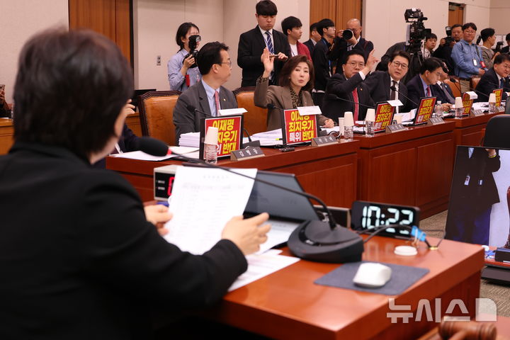 [서울=뉴시스] 조성봉 기자 = 나경원, 송석준, 신동욱 국민의힘 의원이 21일 오전 서울 여의도 국회 윤석열정권정치검찰조작기소의혹사건진상규명국정조사특별위원회에서 열린 서해 공무원 피격•통계조작·윤석열 명예훼손 허위보도 조작기소의혹 사건 청문회에서 서영교 위원장에게 발언권을 신청하고 있다.2026.04.21. [email protected]