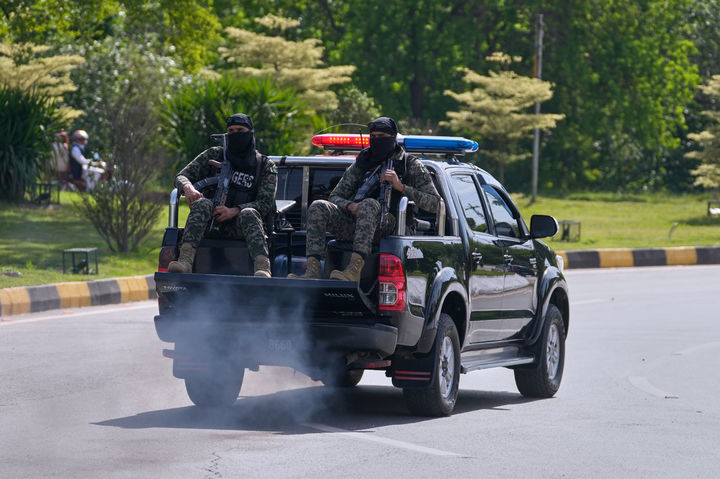 [이슬라마바드=AP/뉴시스] 21일(현지 시간) 파키스탄 이슬라마바드에서 미국과 이란 간 2차 종전 협상을 앞두고 준군사 조직 병력이 주변을 순찰하며 경계를 강화하고 있다. 2026.04.21.