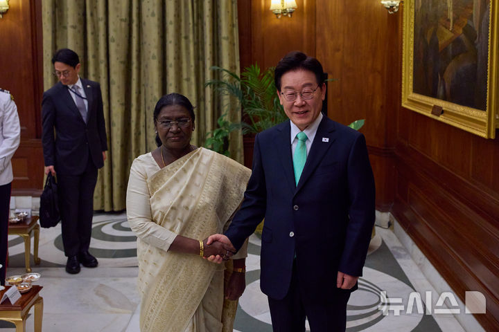 인도 드라우파디 무르무 대통령과 악수하는 이재명 대통령
