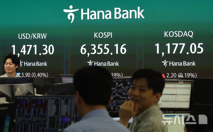 [서울=뉴시스] 권창회 기자 = 21일 오전 서울 중구 하나은행 딜링룸에서 딜러들이 업무를 보고 있다. 코스피가 전 거래일 대비 83.45포인트(1.34%) 상승한 6302.54에 출발했다. 원달러 환율은 4.8원 하락한 1472.4원으로, 코스닥지수는 11.38포인트(0.97%) 오른 1186.23에 거래를 시작했다. 2026.04.21. [email protected]