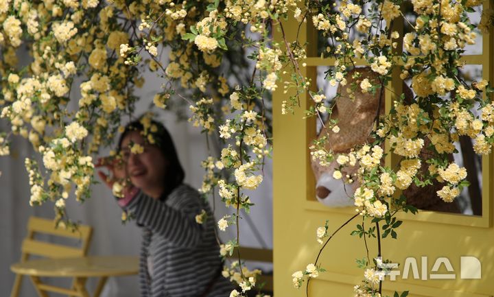 [제주=뉴시스] 우장호 기자 = 맑은 날씨를 보인 21일 오전 제주 시내 한 카페 정원에 넝쿨 장미의 일종인 목향 장미가 활짝 피어나 시선을 사로 잡고 있다.