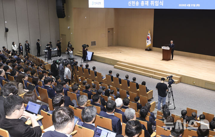 [서울=뉴시스] 조수정 기자 = 신현송 신임 한국은행 총재가 21일 오전 서울 중구 한국은행에서 열린 취임식에서 취임사를 하고 있다. (공동취재) 2026.04.21. [email protected]