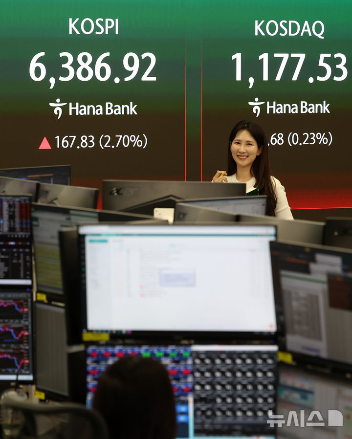 [서울=뉴시스] 이영환 기자 = 21일 오후 서울 중구 하나은행 딜링룸 전광판에 장중 코스피 지수가 6386.92를 나타내고 있다. 2026.04.21. [email protected]
