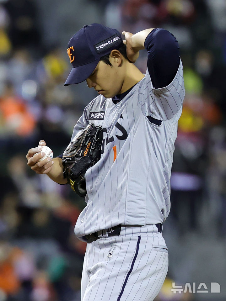 [서울=뉴시스] 홍효식 기자 = 21일 서울 송파구 잠실야구장에서 열린 2026 KBO 리그 한화 이글스와 LG 트윈스의 경기, 4회말 1사 1,2루 한화 선발투수 문동주가 볼넷으로 만루 위기를 맞고 있다. 2026.04.21. [email protected]