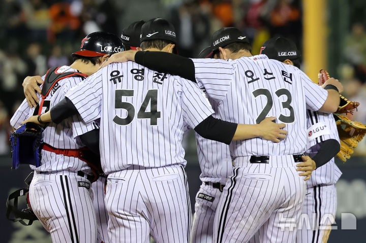 [서울=뉴시스] 홍효식 기자 = 21일 서울 송파구 잠실야구장에서 열린 2026 KBO 리그 한화 이글스와 LG 트윈스의 경기, 6-5로 승리한 LG 선수들이 기뻐하고 있다. 2026.04.21. [email protected]