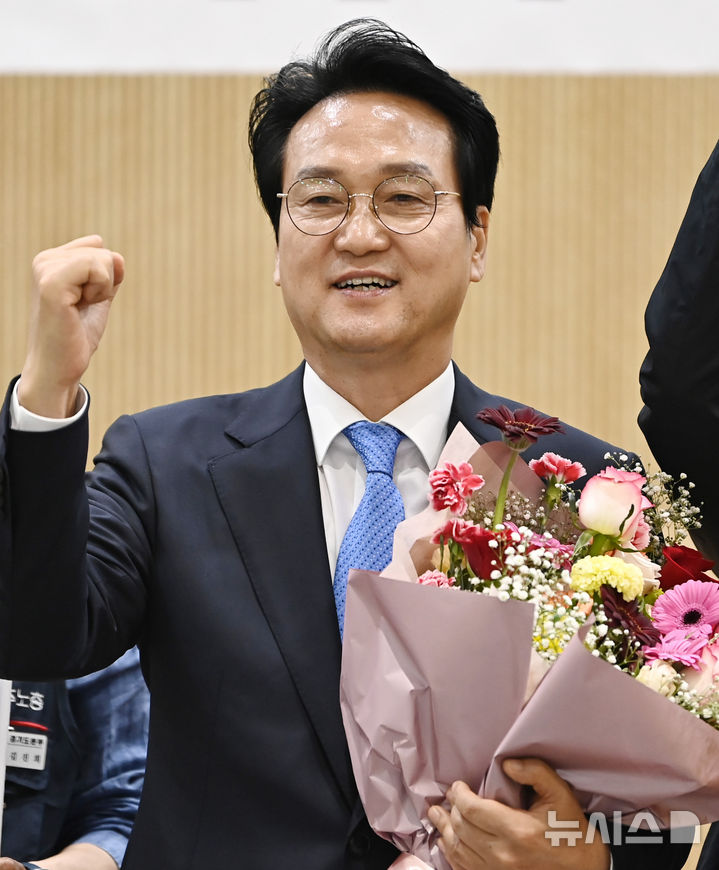 [수원=뉴시스] 김종택기자 = 6·3 지방선거 경기도교육감 선거의 진보 진영 단일후보로 선출된 안민석 예비후보가 22일 경기 수원시 경기도의회에서 기자회견을 마친 뒤 파이팅을 외치고 있다. 2026.04.22. [email protected]