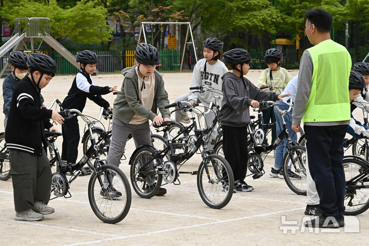 [수원=뉴시스] 김종택기자 = 자전거의 날인 22일 경기 수원시 명당초등학교에서 열린 '찾아가는 자전거·개인형 이동장치(PM) 안전교육에서 학생들이 자전거와환경 사회적협동조합 관계자로부터 안전교육을 받고 있다.