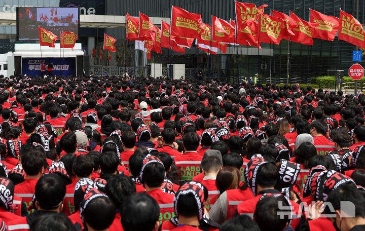 [인천=뉴시스] 홍효식 기자 = 삼성바이오로직스 상생노동조합 조합원들이 22일 인천 연수구 삼성바이오로직스 송도 사업장 앞에서 임금인상 등을 요구하며 투쟁 결의대회를 하고 있다. 2026.04.22. [email protected]