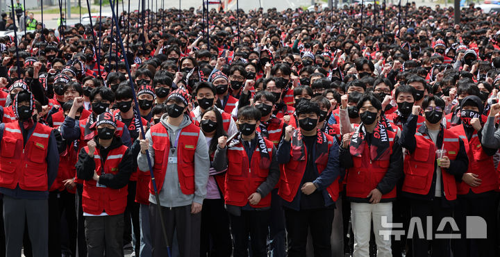 [인천=뉴시스] 홍효식 기자 = 삼성바이오로직스 상생노동조합 조합원들이 22일 인천 연수구 삼성바이오로직스 송도 사업장 앞에서 열린 투쟁 결의대회에서 임금인상 등을 요구하며 투쟁을 외치고 있다.  2026.04.22. [email protected]