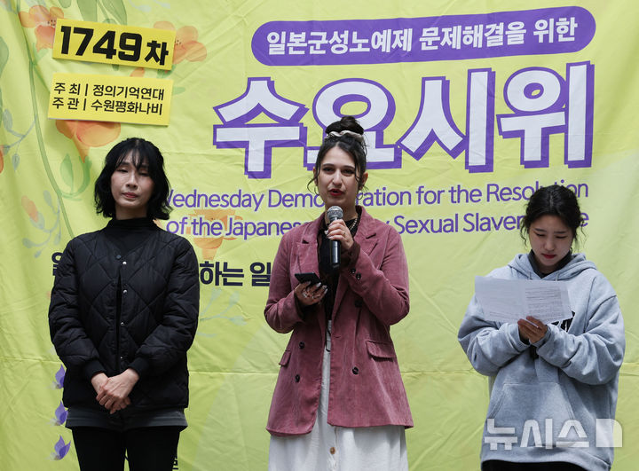 [서울=뉴시스] 조수정 기자 = 재키 사네히(가운데) 독일 미테구 의원이 22일 오후 서울 종로구 옛 주한 일본대사관 앞에서 열린 제1749차 일본군 성노예제 문제해결을 위한 정기 수요시위에 참석해 발언하고 있다. 2026.04.22. [email protected]