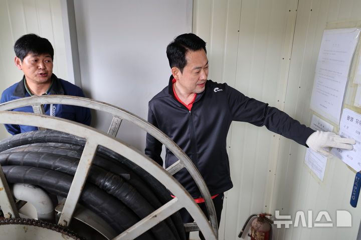 [양양=뉴시스] 김금보 기자 = 장동혁 국민의힘 대표가 22일 오전 강원도 양양군 현남면 남애항에서 어선에 경유를 급유하며 유류가격 인상으로 인한 애로사항을 파악하고 있다. 2026.04.22. [email protected]