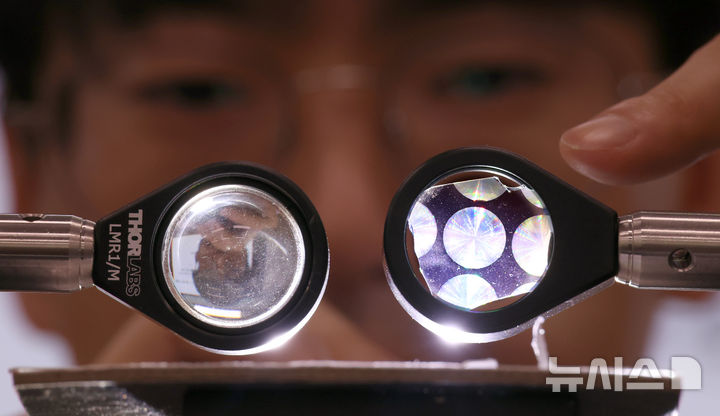 이번 연구성과는 하나의 렌즈로 2D와 3D를 전환할 수 있는 기술로 세계 최고 권위의 학술지인 '네이처'에 게재됐다. 사진은 볼록렌즈와 메타렌즈(오른쪽). 2026.04.23. [email protected]