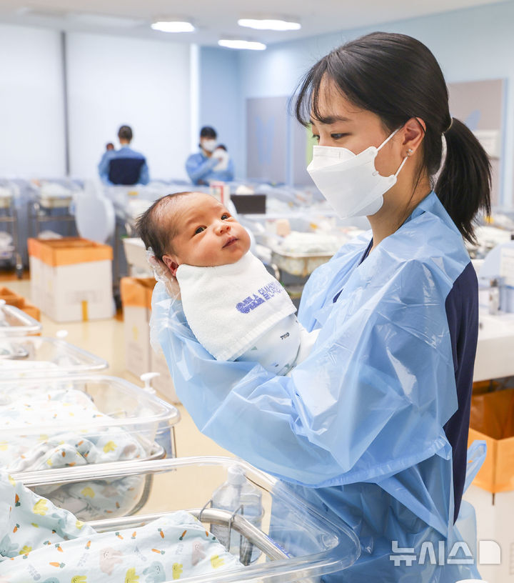 [고양=뉴시스] 정병혁 기자 = 22일 경기 고양시 CHA의과학대학교 일산차병원 신생아실에서 간호사가 신생아들을 돌보고 있다.