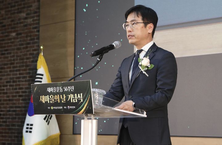 [서울=뉴시스] 김민재 행정안전부 차관이 22일 오후 경기 성남시 새마을운동중앙회에서 열린 '새마을운동 56주년 새마을의 날 기념식'에 참석해 축사를 하고 있다. (사진=행정안전부 제공) 2026.04.22. [email protected] *재판매 및 DB 금지