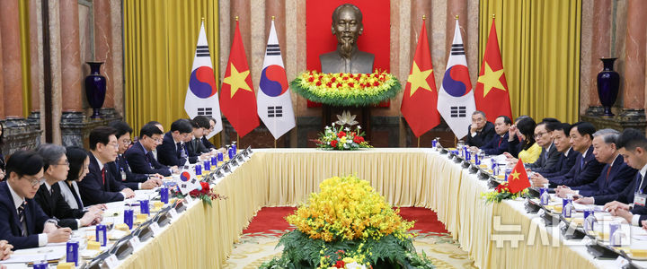 [하노이=뉴시스] 고범준 기자 = 이재명 대통령과 또 럼 베트남 당 서기장 겸 국가주석이 22일(현지 시간) 하노이 주석궁에서 한-베트남 정상회담을 하고 있다. 2026.04.22. [email protected]