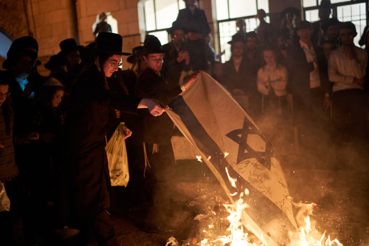 [예루살렘=AP/뉴시스] 이스라엘 독립기념일인 22일(현지 시간) 예루살렘 메아 쉐아림 지역에서 시온주의와 이스라엘 국가에 반대하는 초정통파 유대인들이 독립기념일 반대 시위를 벌이며 국기를 태우고 있다. 2026.04.23.