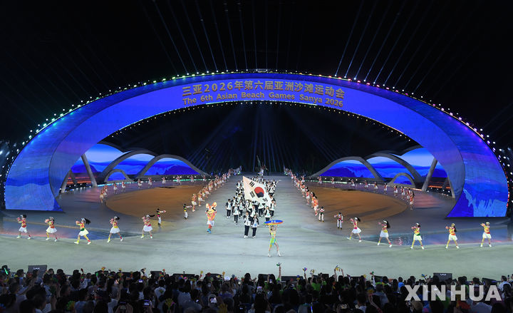 [산야=신화/뉴시스] 대한민국 선수들이 22일(현지 시간) 중국 하이난성 싼야에서 열린 제6회 아시안 비치 게임 개막식에서 태극기를 흔들며 입장하고 있다. 2026.04.23.