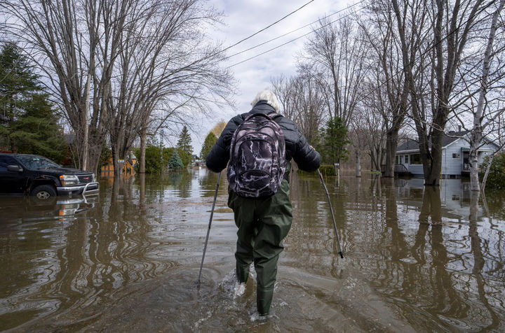 [리고=AP/뉴시스] 22일(현지 시간) 캐나다 퀘벡주 리고에서 홍수로 강물이 불어나자, 한 주민이 등산지팡이를 이용해 침수 도로를 헤치며 집으로 돌아가고 있다. 최근 계속된 폭우와 기온 상승에 따른 해빙 현상으로 강물이 불어나면서 지역 곳곳에 홍수 경보가 발령됐다. 2026.04.23.