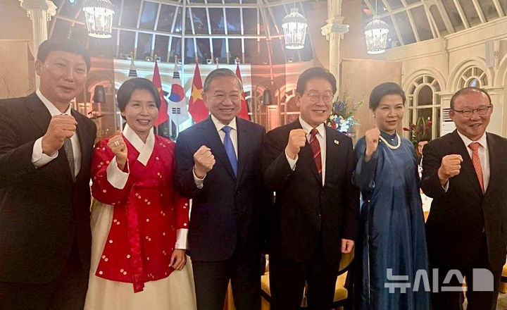 [서울=뉴시스] 고범준 기자 = 이재명 대통령과 또 럼 베트남 당 서기장 겸 국가주석이 22일(현지 시간) 베트남 하노이 영빈관에서 열린 국빈만찬에서 참석자들과 기념촬영을 하고 있다.