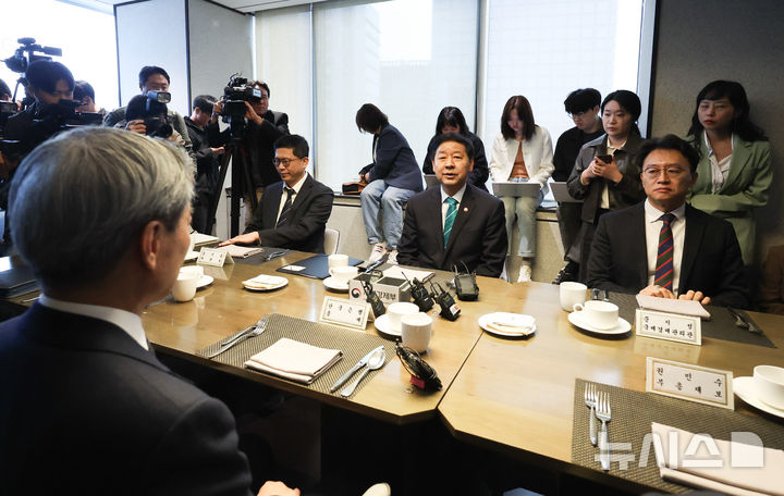 [서울=뉴시스] 최진석 기자 = 구윤철(오른쪽 두번째) 경제부총리 겸 재정경제부 장관이 23일 서울 중구 은행회관 뱅커스클럽에서 열린 신현송 한국은행 총재와의 조찬회동에서 발언하고 있다. 2026.04.23. [email protected]