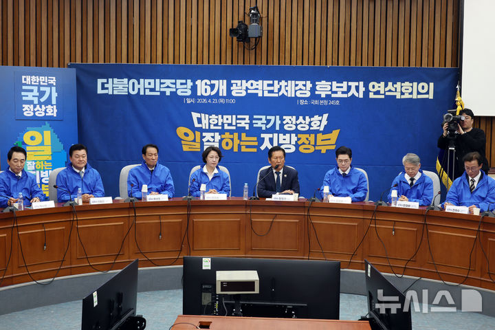 [서울=뉴시스] 고승민 기자 = 정청래 더불어민주당 대표가 23일 서울 여의도 국회에서 열린 16개 광역단체장 후보자 연석회의에서 인사말을 하고 있다. 2026.04.23. [email protected]
