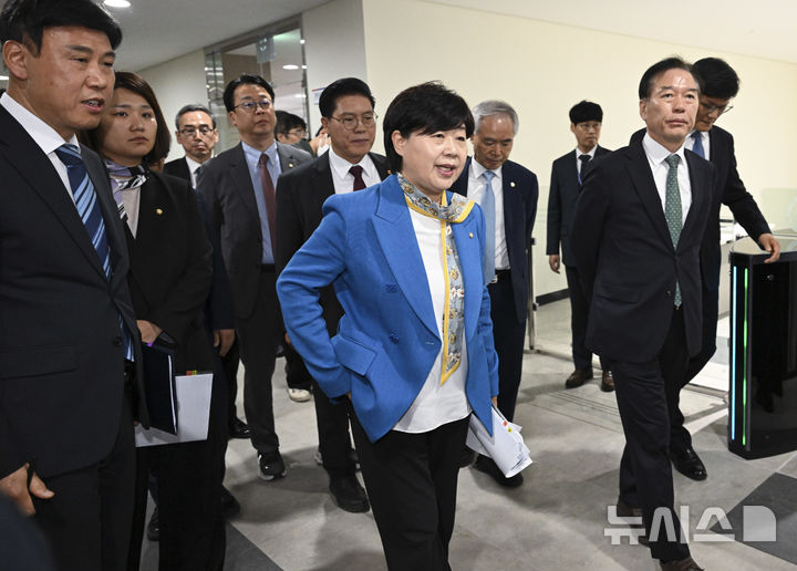 [서울=뉴시스] 국회사진기자단= 서영교 위원장 등 위원들이 23일 서울 종로구 감사원에서 열린 윤석열 정권 정치검찰 조작기소 의혹 사건 진상규명 국정조사특별위원회 현장조사를 위해 열람실로 이동하고 있다. 2026.04.23. [email protected]