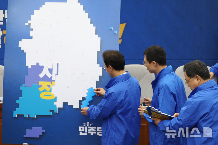 [서울=뉴시스] 고승민 기자 = 전재수 더불어민주당 부산시장 후보가 23일 서울 여의도 국회에서 열린 16개 광역단체장 후보자 연석회의에서 퍼포먼스를 하고 있다. 2026.04.23. [email protected]
