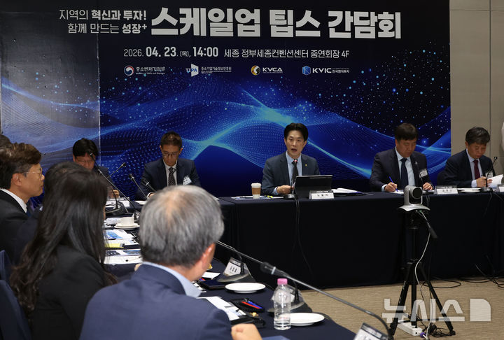 [세종=뉴시스] 강종민 기자 = 노용석 중소벤처기업부 차관이 23일 세종시 정부세종컨벤션센터에서 열린 스케일업 팁스 간담회에서 중소·벤처기업 및 운영사 대표들과 의견을 나누고 있다.