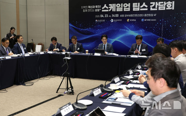 [세종=뉴시스] 강종민 기자 = 노용석 중소벤처기업부 차관이 23일 세종시 정부세종컨벤션센터에서 열린 스케일업 팁스 간담회에서 중소·벤처기업 및 운영사 대표들과 의견을 나누고 있다.
