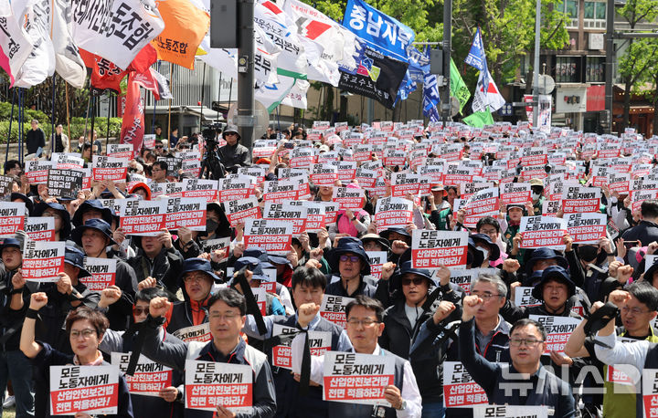 [서울=뉴시스] 박주성 기자 = 민주노총 조합원들이 23일 오후 서울 숭례문 앞에서 열린 4.23 민주노총 결의대회에서 구호를 외치고 있다. 2026.04.23. [email protected]