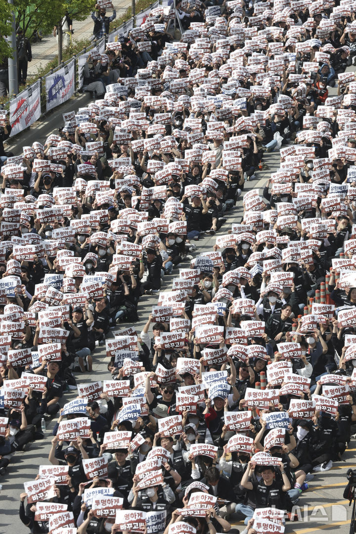 [평택=뉴시스] 김근수 기자 = 삼성전자노동조합 공동투쟁본부 조합원들이 23일 오후 경기 평택시 삼성전자 평택사업장 앞에서 열린 투쟁결의대회에서 구호를 외치고 있다. (공동취재) 2026.04.23. [email protected]