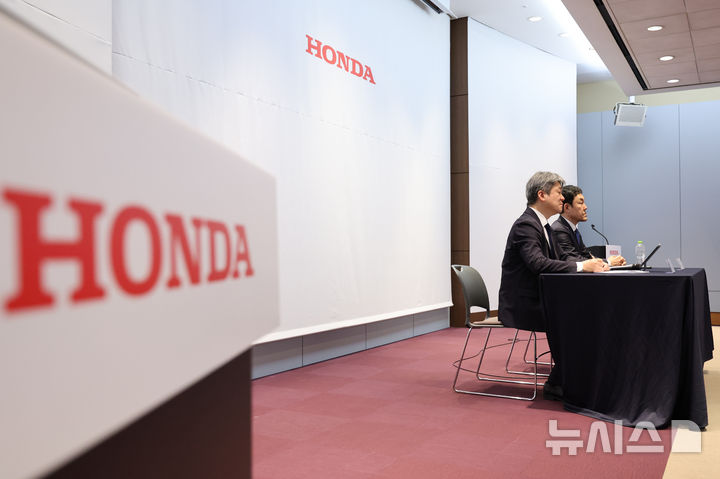 [서울=뉴시스] 황준선 기자 = 이지홍 혼다 코리아 대표이사가 23일 오후 서울 강남구 코엑스에서 열린 혼다 코리아 자동차 시장 철수 관련 기자회견에서 발언하고 있다. 2026.04.23. [email protected]