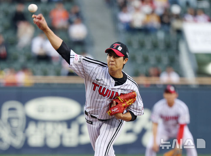 [서울=뉴시스] 김진아 기자 = 23일 오후 서울 송파구 잠실야구장에서 열린 2026 KBO리그 한화 이글스와 LG 트윈스의 경기, LG 선발 이정용이 역투하고 있다. 2026.04.23. [email protected]