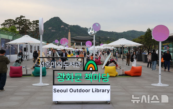 [서울=뉴시스] 권창회 기자 = 23일 서울 종로구 광화문광장에서 열린 2026 서울야외도서관 광화문책마당 개장 행사에서 시민들이 책을 읽고 있다. 2026.04.23. [email protected]