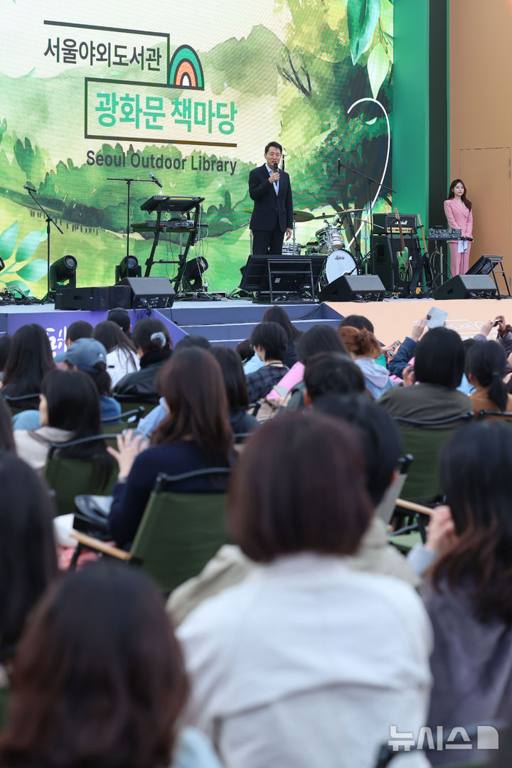 [서울=뉴시스] 권창회 기자 = 오세훈 서울시장이 23일 서울 종로구 광화문광장에서 열린 2026 서울야외도서관 광화문책마당 개장 행사에서 인사말을 하고 있다. 2026.04.23. [email protected]