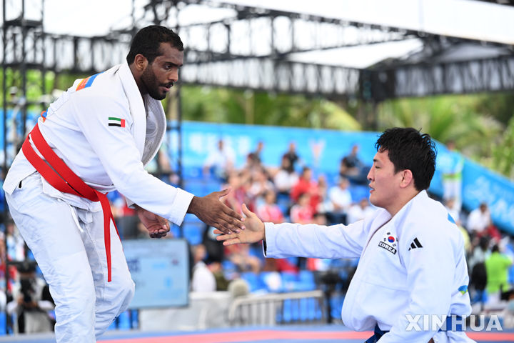 [산야=신화/뉴시스] 구본철(오른쪽)이 24일(현지 시간) 중국 하이난성 산야에서 열린 제6회 아시안 비치 게임(ABG) 주짓수 남자 77㎏급 준결승에서 마흐디 알라울라키(UAE)에게 패한 후 악수하고 있다. 구본철이 0-4로 패해 결승에 오르지 못했다. 2026.04.24.