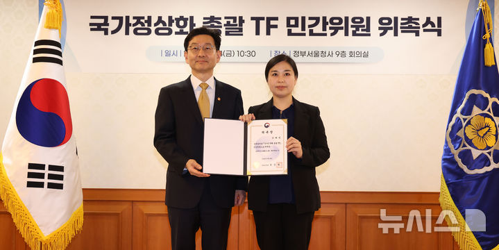 [서울=뉴시스] 김선웅 기자 = 윤창렬 국무조정실장이 24일 서울 종로구 정부서울청사에서 열린 국가정상화 총괄 TF 민간위원 위촉식에서 김혜민 위원(카이스트 문술미래전략대학원 박사과정)에게 시민사회 분야 민간위원 위촉장을 수여하고 있다. 2026.04.24. [email protected]