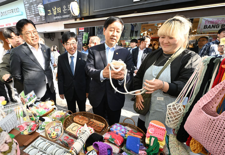 [서울=뉴시스] 조성우 기자 = 구윤철 부총리 겸 재정경제부 장관이 24일 인천 부평구 문화의 거리에서 개최 중인 '동행축제' 행사장을 방문해 소상공인을 격려하고 있다. (사진=재정경제부 제공) 2026.04.24. [email protected] *재판매 및 DB 금지