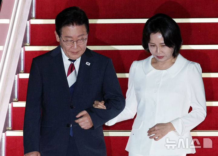 [성남=뉴시스] 고범준 기자 = 인도-베트남 국빈 방문일정을 마친 이재명 대통령과 김혜경 여사가 24일 경기 성남 서울공항에 도착해 공군1호기에서 내리고 있다. 2026.04.24. [email protected]