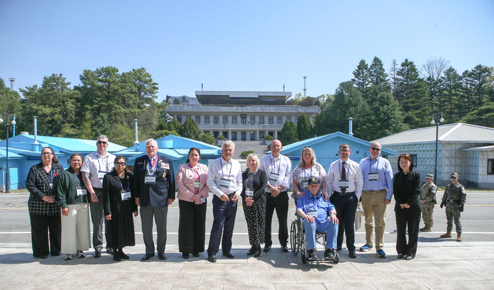 [서울=뉴시스] 황준선 기자 = 가평전투 75주년을 맞아 방한한 영연방 4개국( 영국, 캐나다, 호주, 뉴질랜드) 참전용사와 유가족 26명이 25일 오전 경기 파주시 비무장지대(DMZ) 내 판문점을 찾아 기념촬영을 하고 있다. (사진=국가보훈부 제공) 2026.04.25.. [email protected] *재판매 및 DB 금지