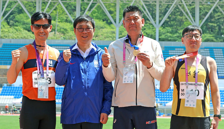 [서울=뉴시스] 황준선 기자 = 최휘영 문화체육관광부 장관이 25일 2026 전국생활체육대축전 육상 경기가 열리고 있는 경남 김해종합운동장을 찾아 수상자들과 기념촬영을 하고 있다. (사진=문화체육관광부 제공) 2026.04.25. [email protected] *재판매 및 DB 금지